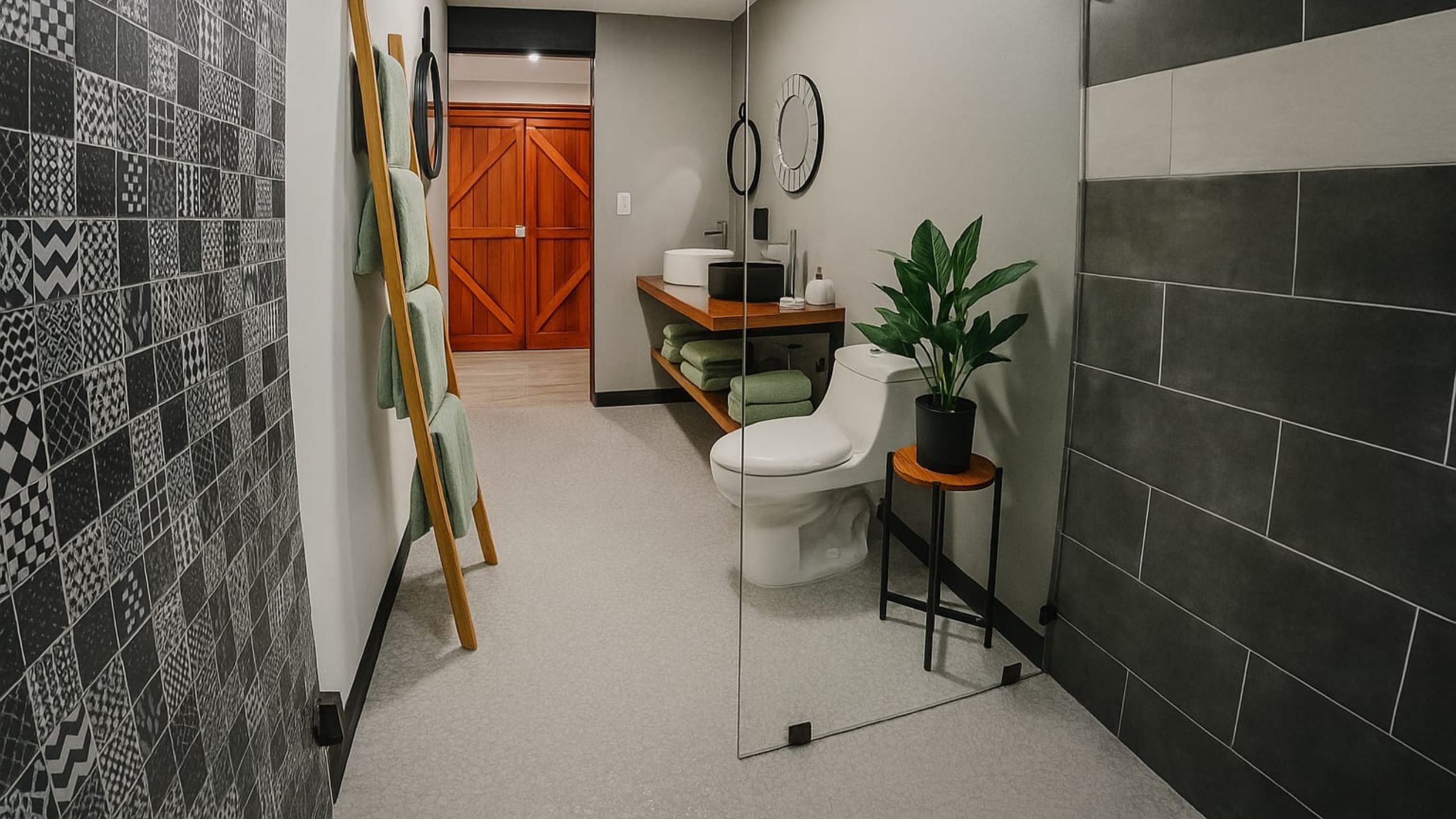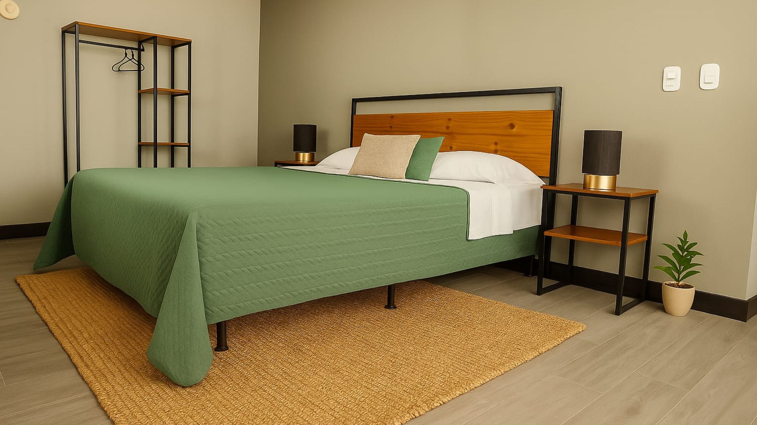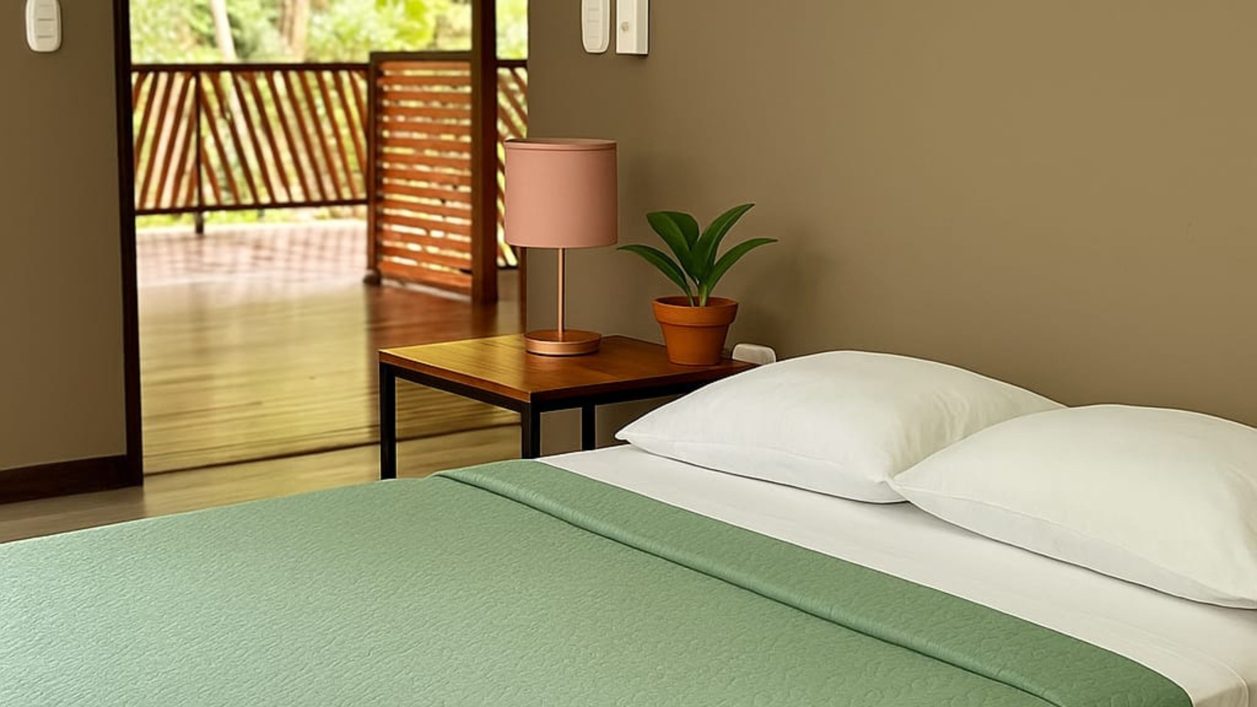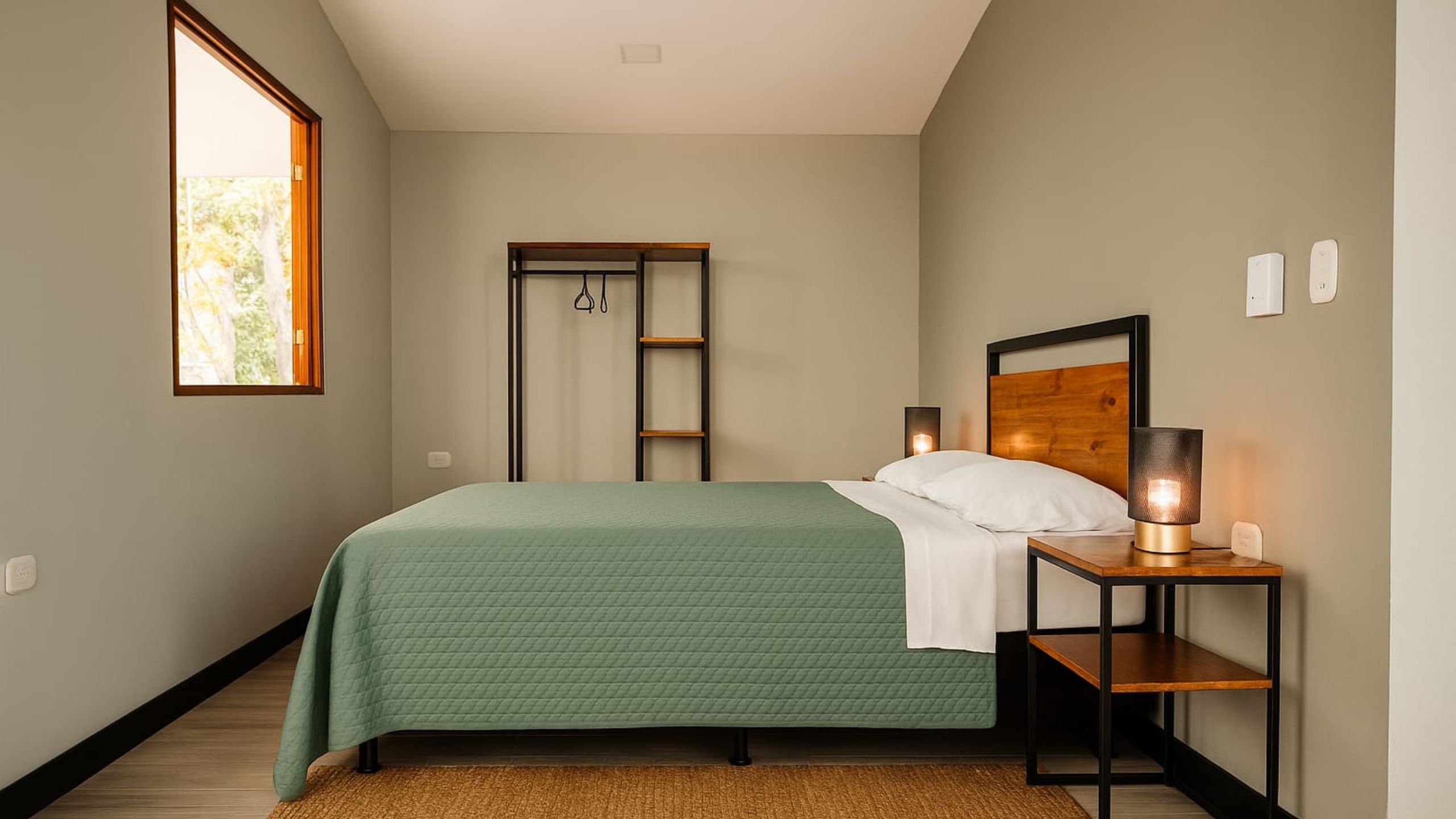 40 m² room with independent entrance and a furnished private terrace (~20 m²). Beds: 1 Double + 1 Single. Includes desk, wardrobe, hairdryer. No kitchen/kitchenette. Fast Wi-Fi; daily housekeeping; hot water via solar/grid. 15 % OFF Code LOWRATE